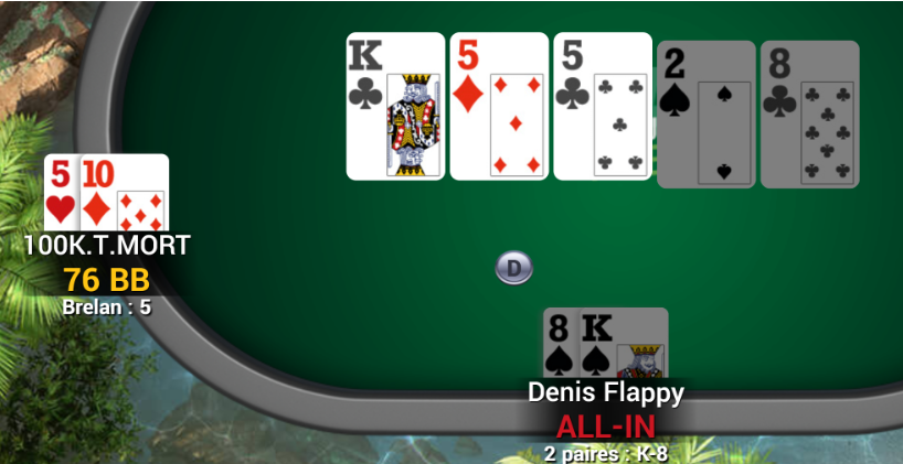 Et place au HU... qui aurait pu durer qu'une seule main, puisque les 2 finalistes partent à tapis, A8s<88 en défaveur de Denis Flappy, qui couvre son adversaire.