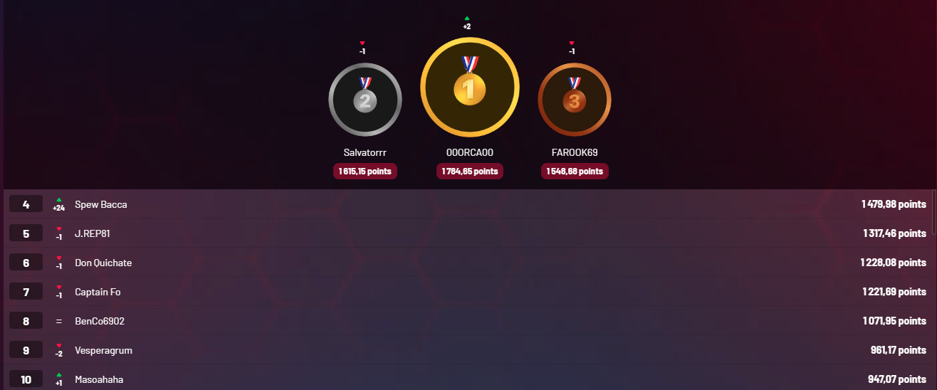 À L'issue de cette manche, le top 10 du classement final évolue légèrement. Le podium reste le même, en notant la remontée d'00ORCA00. La victoire de Spew Bacca lui fera atteindre le pied du podium. Encore quelques points pour l'atteindre !