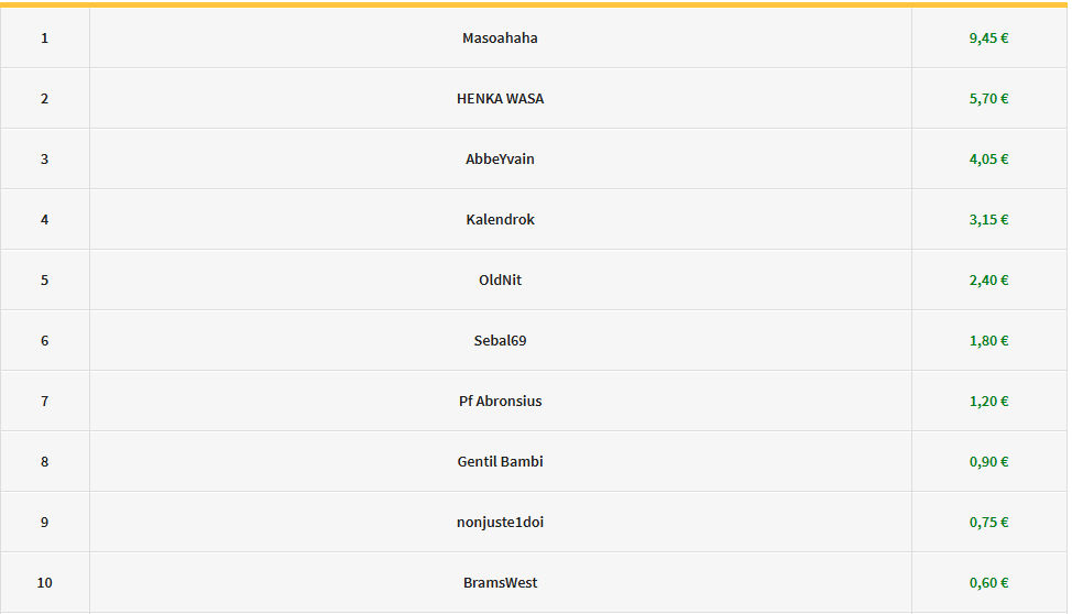 Comme vous le voyez, ça s'est tapé fort fort pour grimper, et au final, c'est HENKA WASA (9DEMAI) qui trébuchera 2ème, mais remportant juste assez de places pour se hisser dans les places payées, avec la 10ème position pour un ticket 5€. Bravo l'artiste !