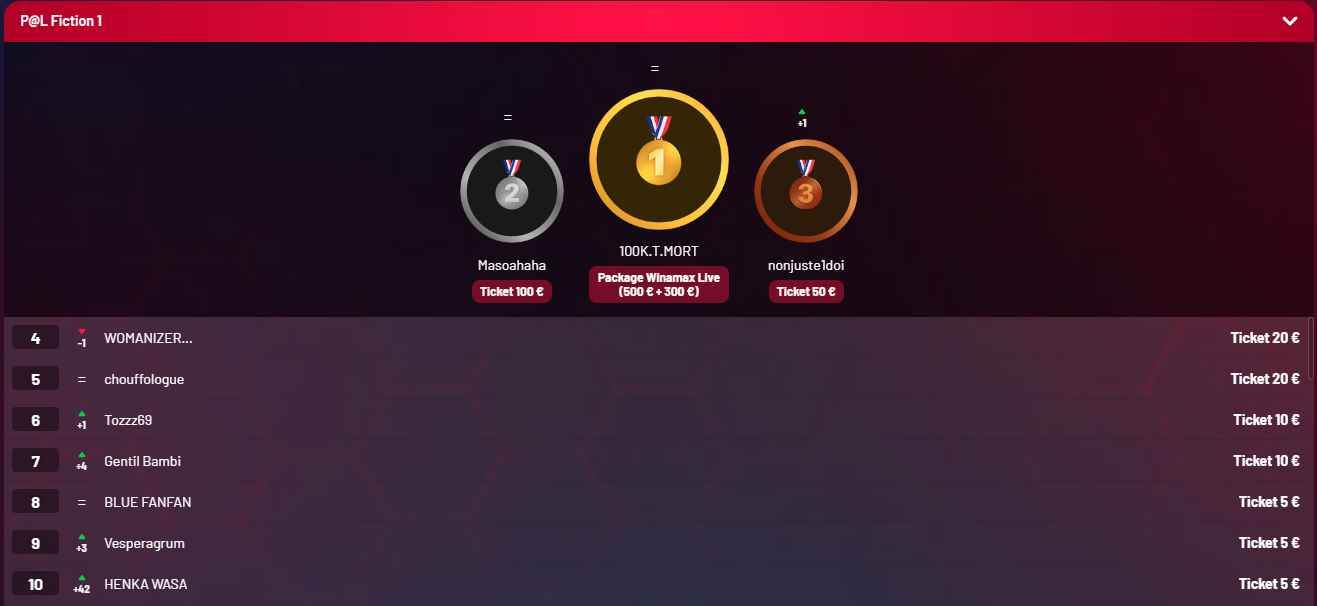 Lors de ce tournoi, Chouffologue, 5ème au classement général, termine 45ème, mais on ne sait comment, cela maintient son classement. Quant au premier en lice, 100K.T.MORT (El Profesor), il cède en 29ème place, ce qui, et il ne le sait pas encore, le maintiendra à la 1ère place du classement. Disons le d'ores et déjà, VGG à lui, il repart avec le package. Et celui qui ne savait pas encore que c'était déjà perdu, c'est belle et bien Masoahaha (Masoath), qui non content de remporter cette manche, conservera sa place de deuxième pour repartir avec un ticket 100€. GG à lui également ! Voyons un peu le classement de fin de P@L Fiction